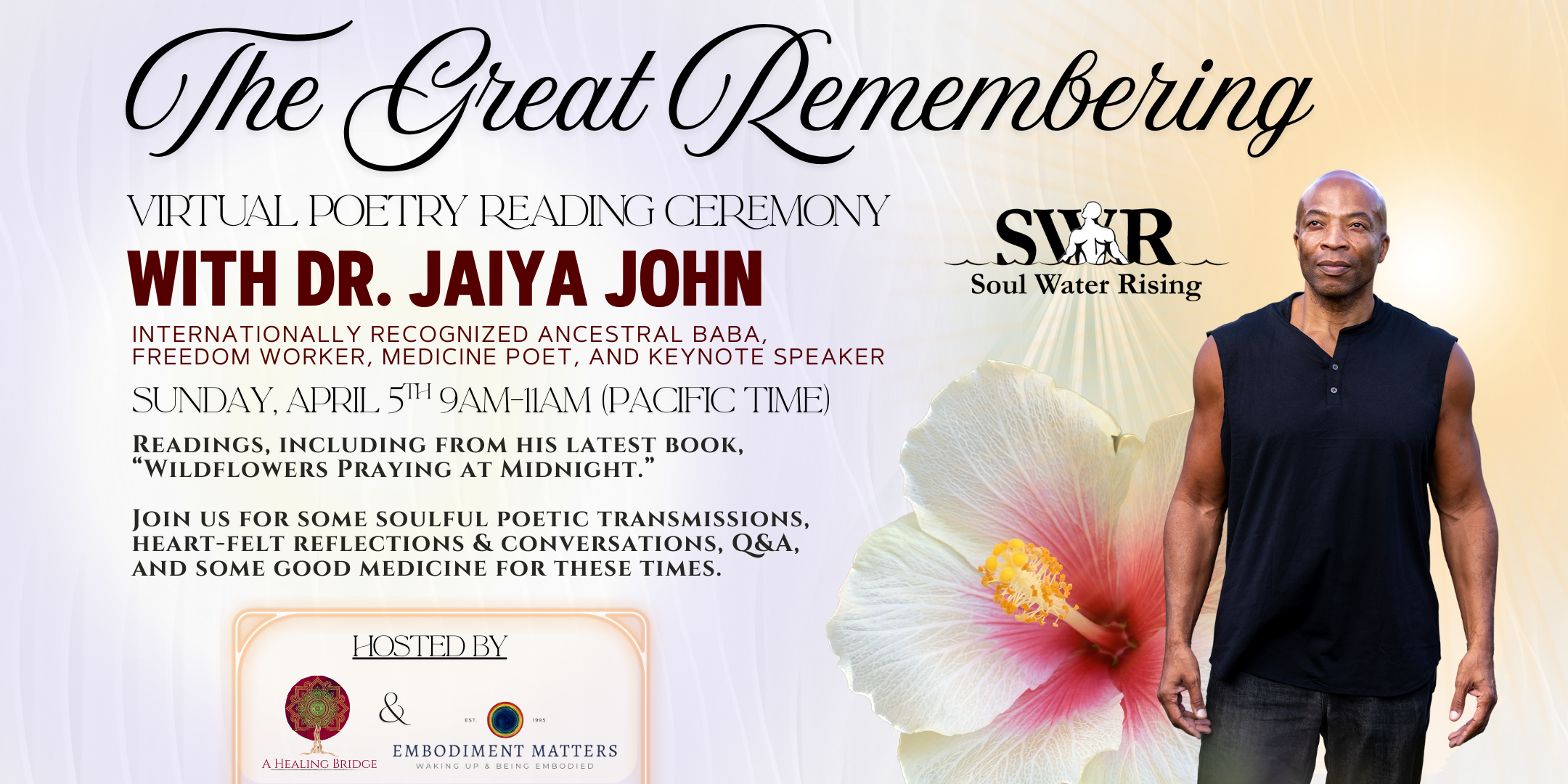 After this, Jaiya moves us into a sacred poetry reading from his published and unpublished work. As a freedom worker, Jaiya’s writings do not avoid addressing oppressive struggle in the world, but instead directly confront it with Love’s unwavering standard. No spiritual bypassing. Organic, mystic medicine fresh from the spirit garden to nourish your heart, soul, and life divinely.
